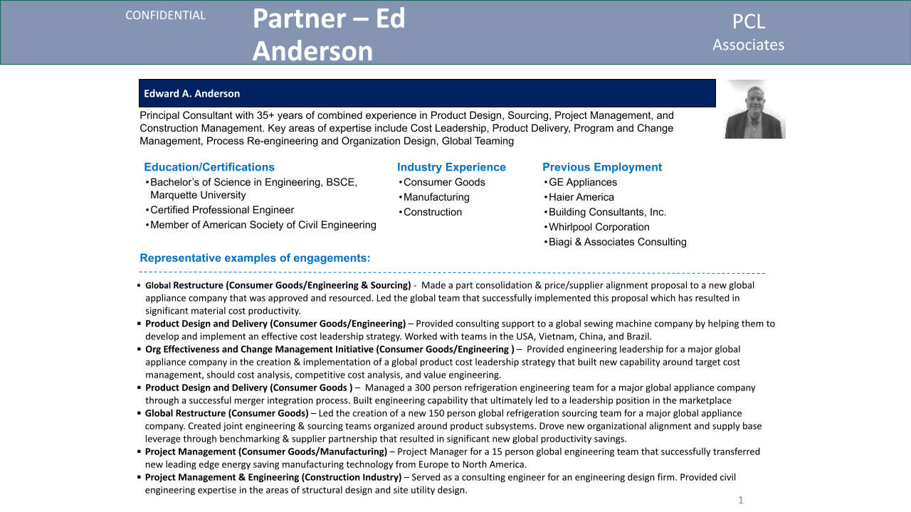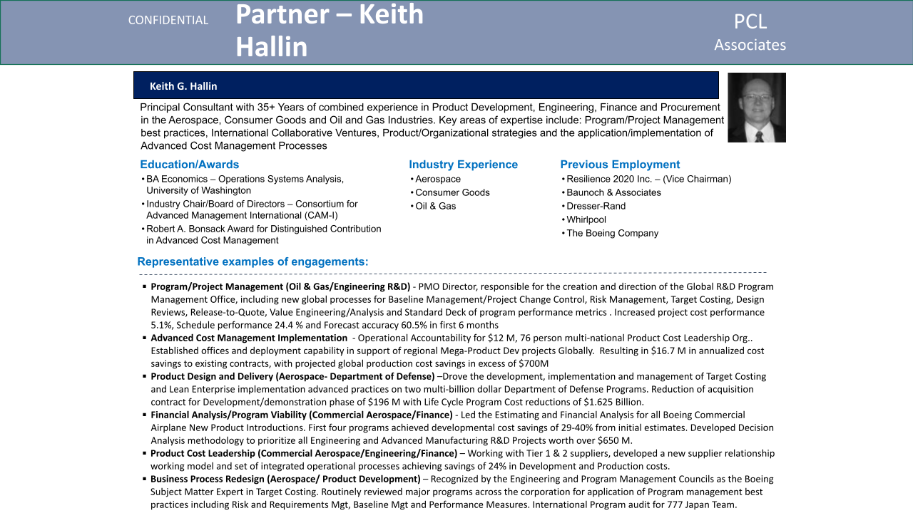 eanderson@pcl-associates.com Full BioPrincipal Consultant with 35+ Years of combined experience in Product Development, Engineering, Finance and Procurement in the Aerospace, Consumer Goods, and Oil and Gas Industries. Key areas of expertise include: Program/Project Management best practices, International Collaborative Ventures, Product/Organizational strategies and the application/implementation of Advanced Cost Management Processes